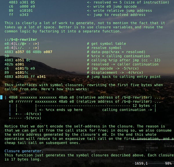 A functional JIT-compiled language with a computed grammar, written in machine code. It borrows elements from Lisp, FORTH, and Smalltalk. Hoping to ship this end of 2018.